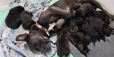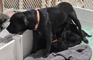 Her 11 large puppies (6 boys & 5 girls) have their eyes open now, are moving around and starting to play, bark, & growl... demanding more & more milk and attention from their mother!!!