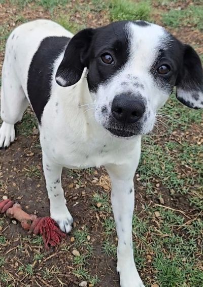 Likely a mix of many breeds, Evie is an adorable pup! She's mostly white with black patches & a spattering a freckles all over. Her floppy ears are precious. Her tail is expressive & usually curled. She's been spayed, fully vaccinated, heartworm tested negative & microchipped. She's current on heartworm prevention & flea prevention.