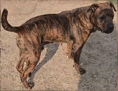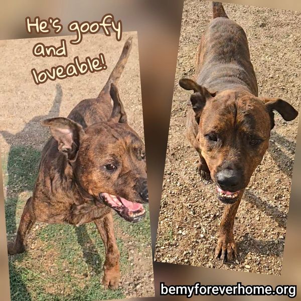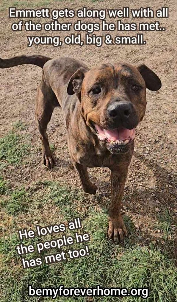 Emmett gets along with all of the other dogs he has met.. young, old, big & small. He loves all people too! He's likely good around cats due to his gentle nature. He's goofy & loveable. Housetrained & crate trained. Appears to be a mastiff mix. Approx 8 yrs & 75 lbs. Huggable!