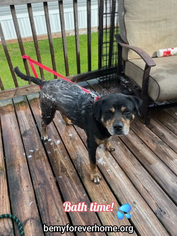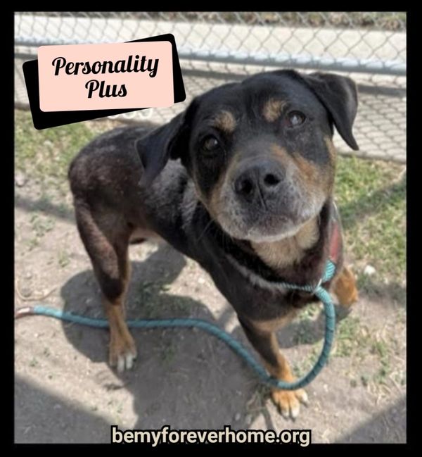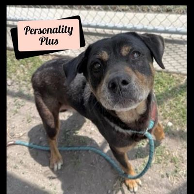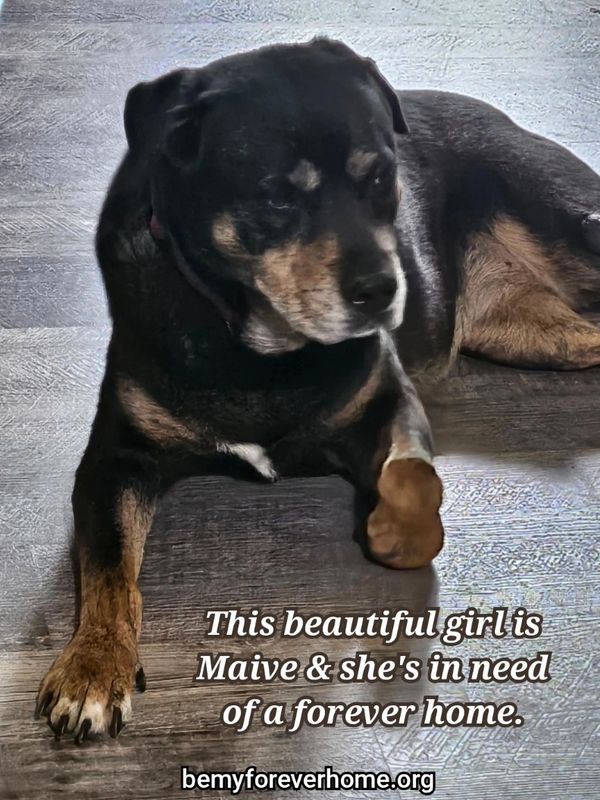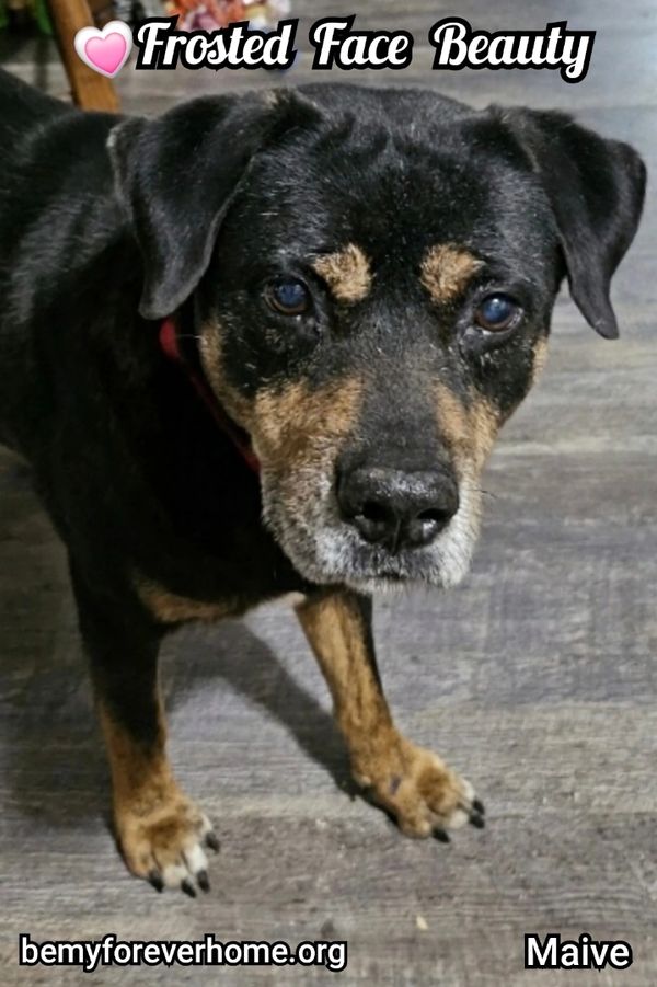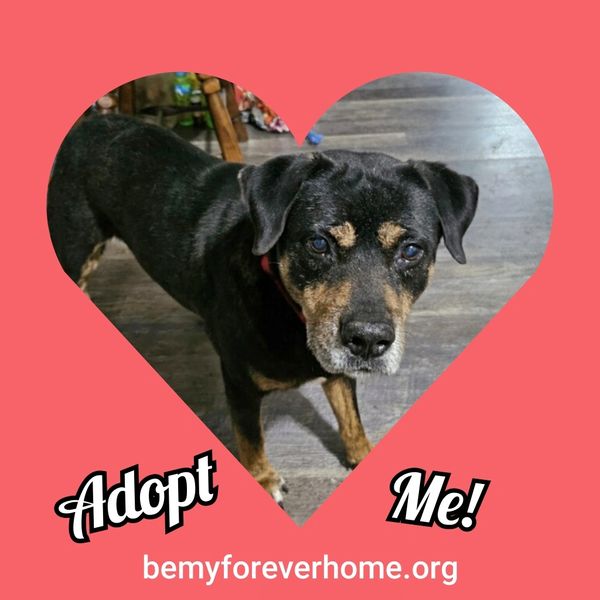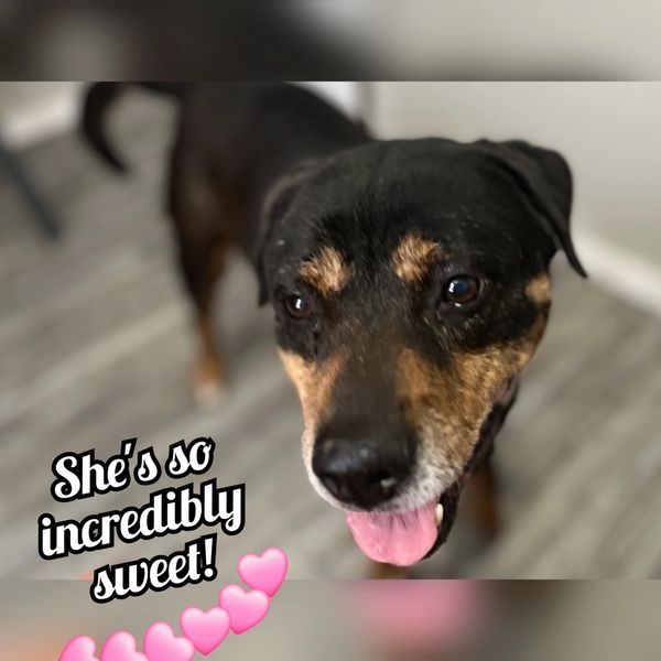 She appears to be a small version of a Rottie mix. She's spayed, vaccinated, microchipped, & heartworm tested negative. She's current on heartworm prevention & flea prevention. She's ready to find a forever home where she can live out her golden years surrounded by love.